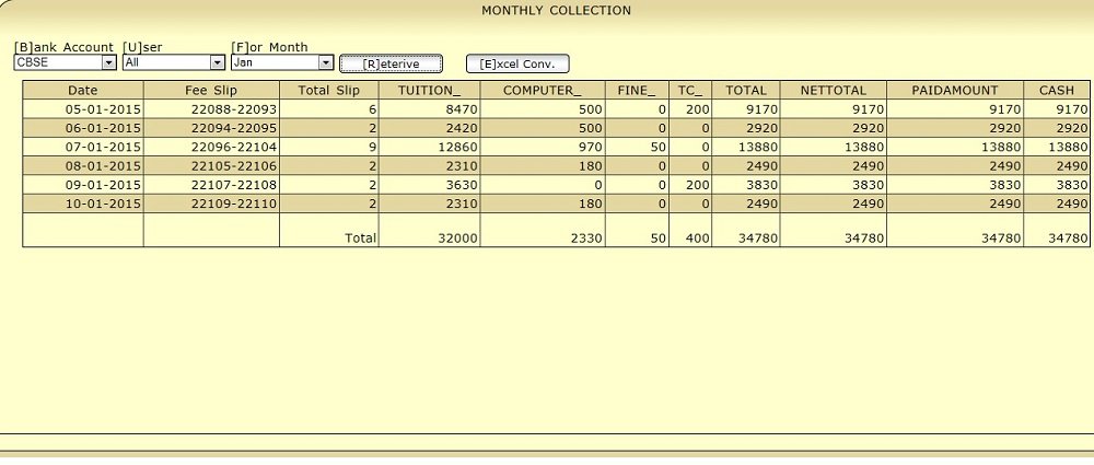 - Automatic generation of daily collection, monthly books and yearly summary